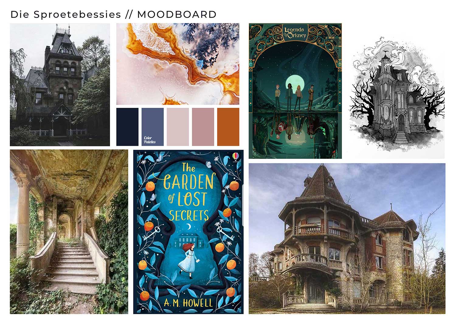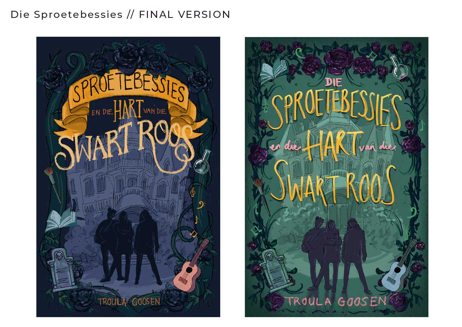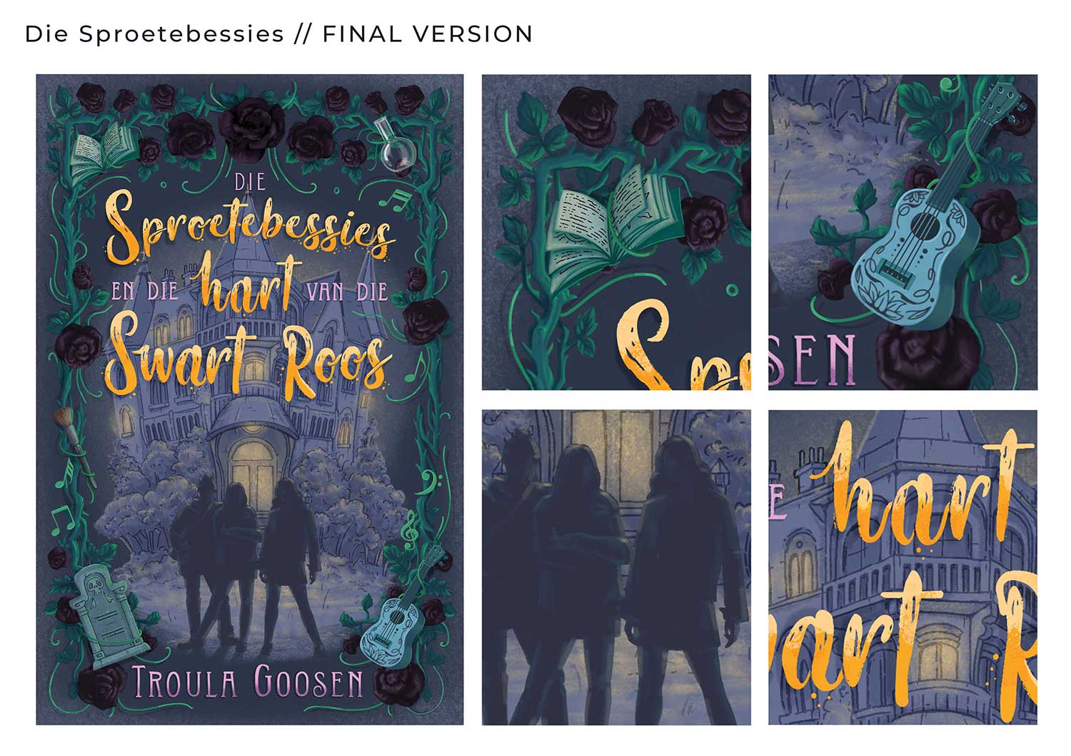 For this fun project I was commissioned by Human & Rousseau Publishers to illustrate the cover of Troula Goosen’s book, “Die Sproetebessies en die hart van die swart roos”. The brief was to illustrate the three main characters of the book in front of an old, gothic house, with black roses and elements from the story in the border of the design. The story is written in Afrikaans and aimed at teenage girls.
